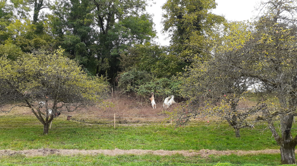Zusammen spazieren wir in Feldbach vom Bahnhof zum Bauernhof. Schon von weit her sah ich Ziegen auf einer Böschung. Für was braucht es die? Nicht für Milch, sondern für die Landschaftspflege, insbesondere die Brombeersträuche, die sie dank ihrer widerstandsfähigen Zungen essen können. Das ist ein wichtiges Prinzip der Permakultur, erklärte mir die Freundin. Die Tiere arbeiten eben wie die Menschen auf dem Hof mit. Die Freundin war ganz aufgeregt: seit dem letzten Mal haben die Ziegen ganze Arbeit geleistet. Näher auf dem Weg passieren wir eine Schar Enten, die sich frei bewegen. Sie sind die fähigsten Mitarbeiterinnen gegen Schnecken, ganz wichtig, dass sie sich auf dem Hof wohl fühlen.